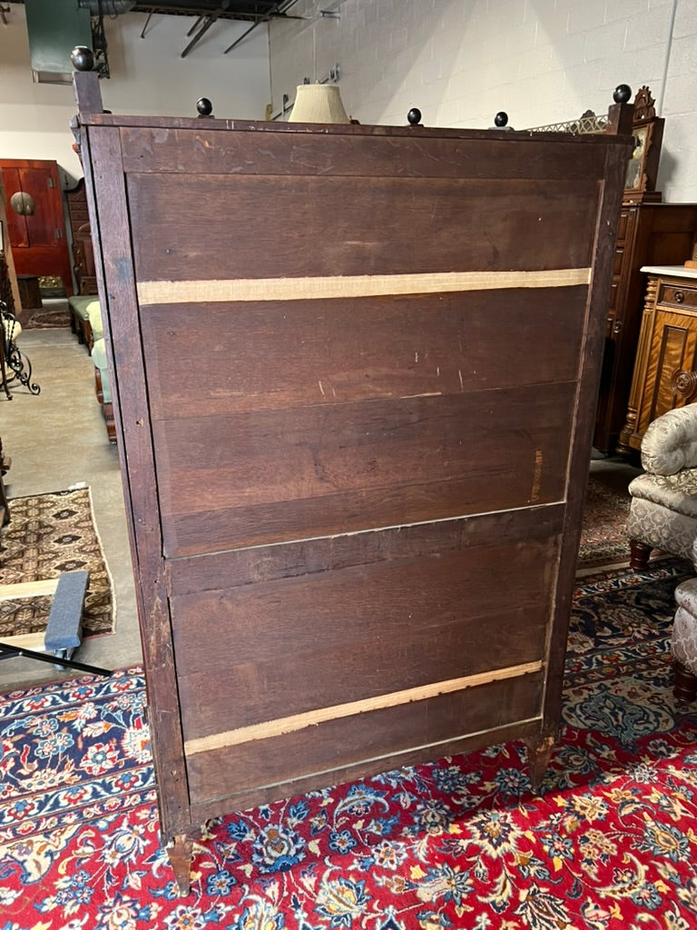 However, due to the movement of the underlying oak base wood, the veneers on the writing surface have separated at the center. This is a common issue in antique furniture, caused by natural shifts in wood over time. The overall structure of the piece remains strong, though, and this minor imperfection is part of the history that gives the piece character. The doors below conceal additional storage, and the fluted columns and decorative brass inlays enhance its stately presence. The piece rests on delicately tapered legs, which, while well attached, are quite fragile and should be handled with care to avoid stress on their slender form.