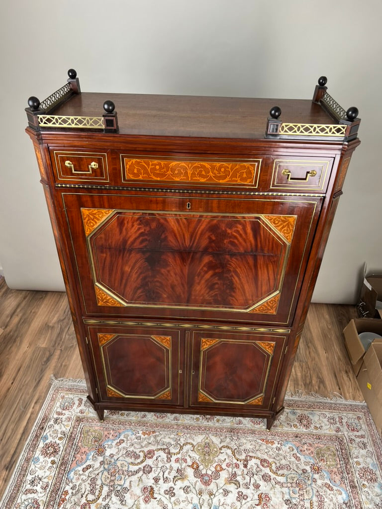In addition to the structural integrity of the secrétaire, the brass hardware and inlay work are in excellent condition, maintaining their original shine. Though the veneer on the writing surface shows signs of age and use, it does not detract from the overall charm and timeless appeal of this piece. Despite the delicate legs and veneer separation, this secrétaire remains an elegant addition to any room, offering both beauty and functionality with its neoclassical design and practical storage. 65h x 39w x 20d