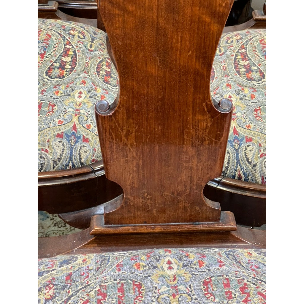 Each chair is upholstered with beautifully patterned fabric seats, offering both comfort and an elegant touch of color. The armchairs are distinguished by their scrolled arms, making them perfect for the heads of the dining table. These chairs strike a balance between historical refinement and functional durability, embodying the enduring appeal of classic Georgian design.