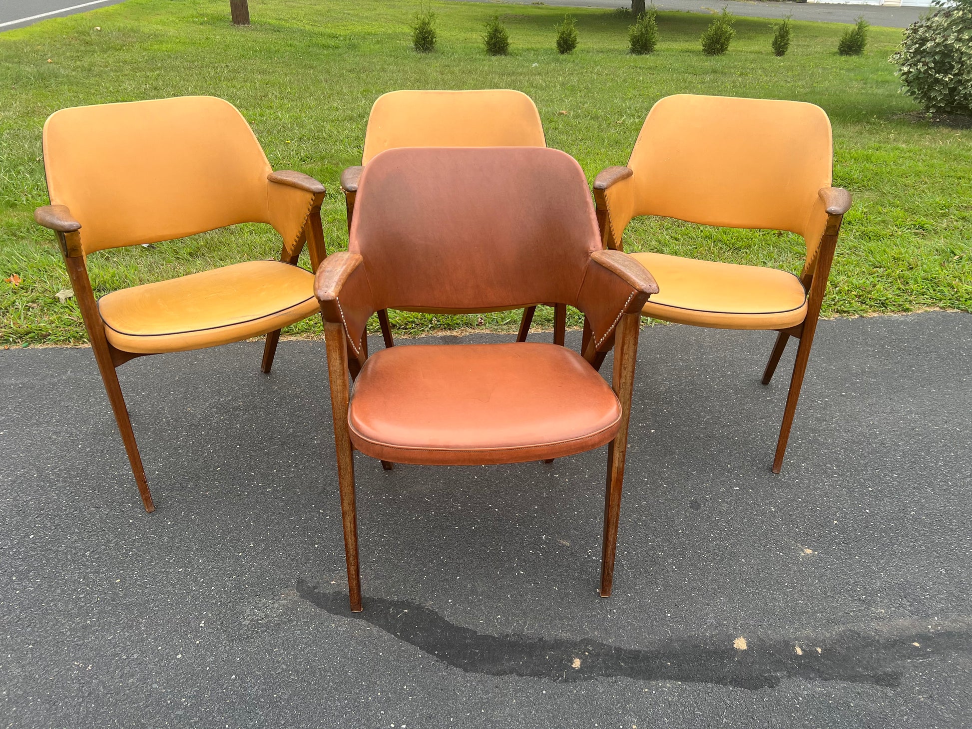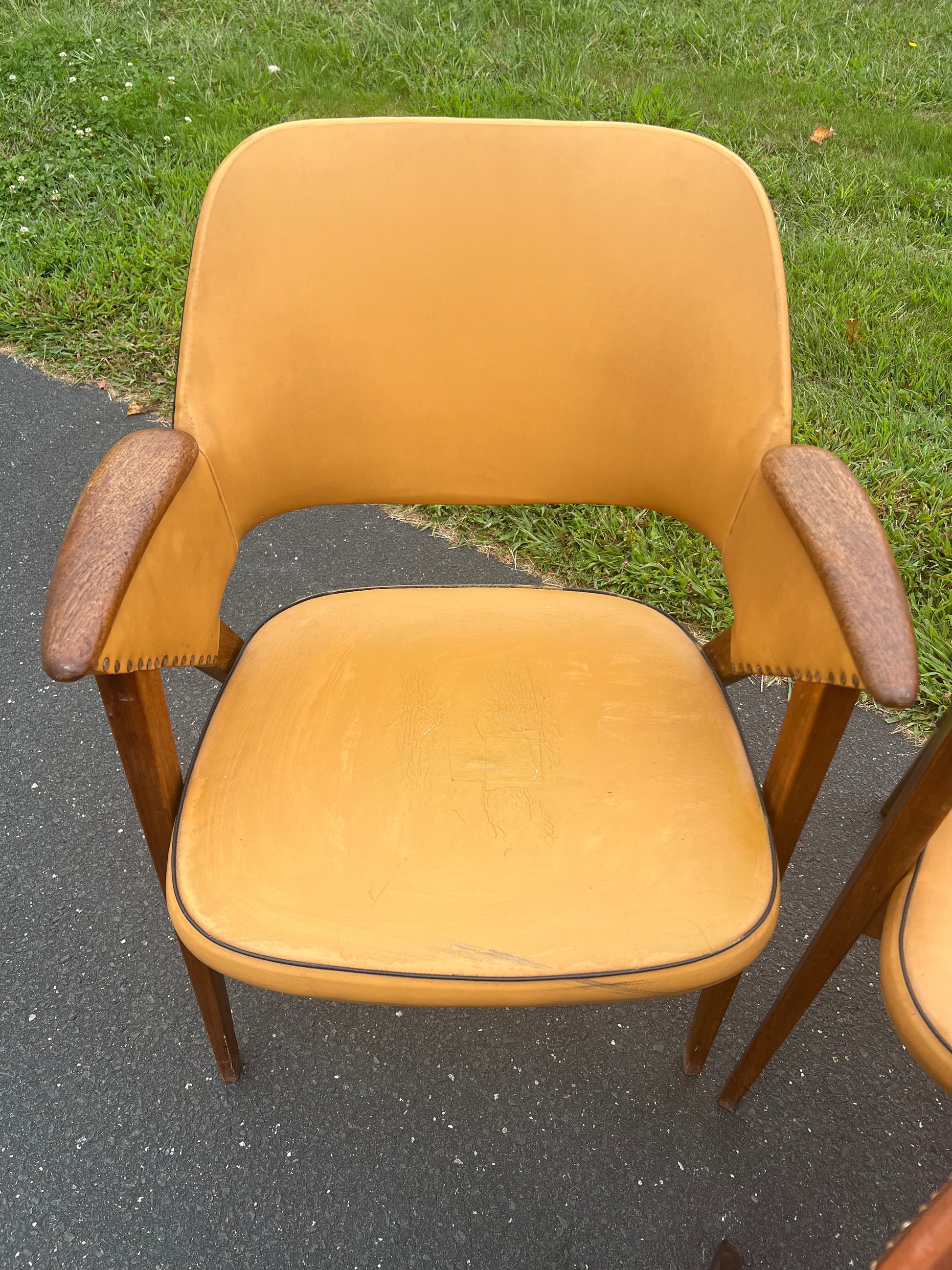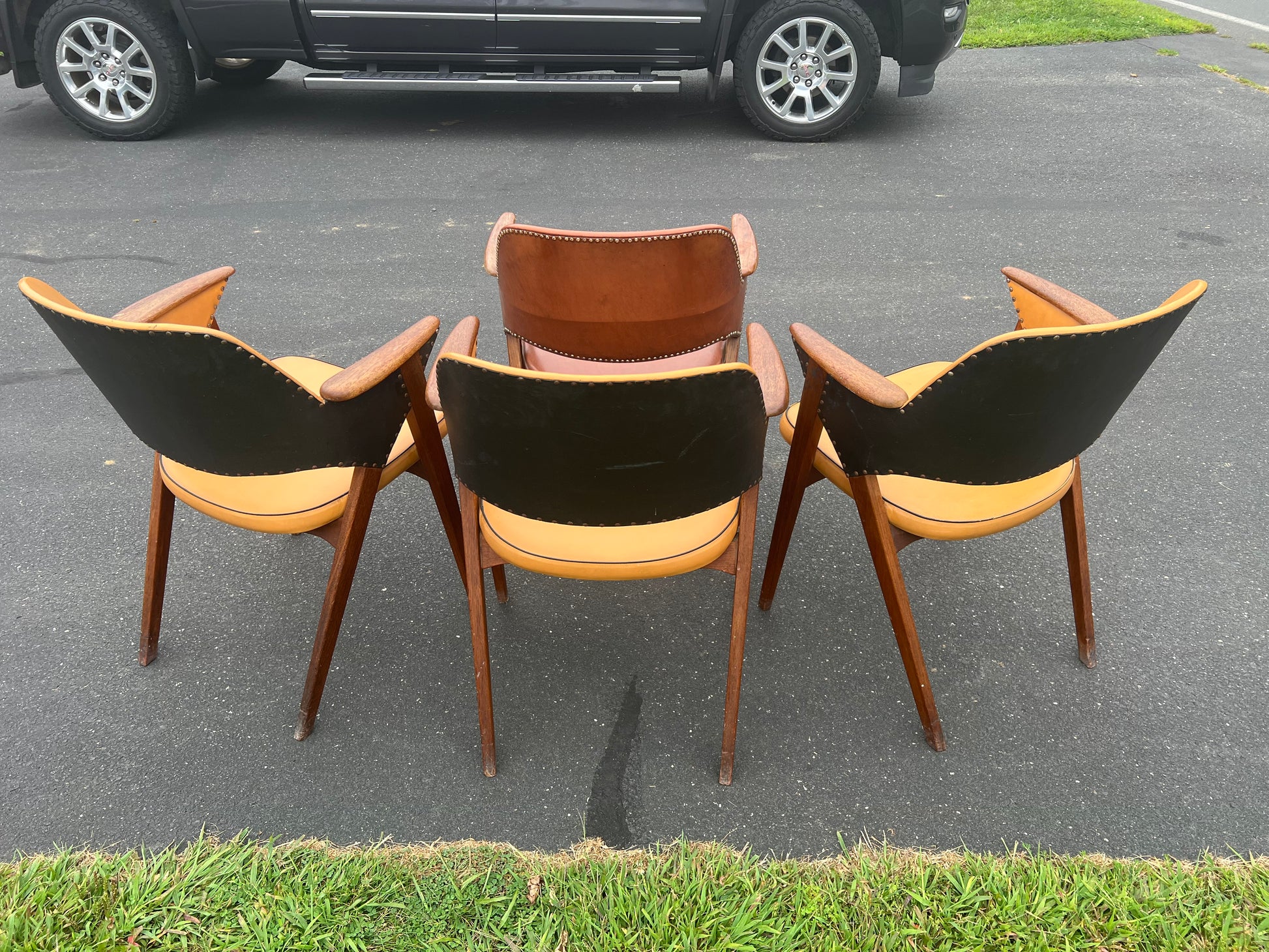 Ideal for collectors and enthusiasts of midcentury design, these chairs offer flexibility in use. They can be enjoyed in their current state, which speaks volumes of their journey through time, or they could be re-upholstered and refinished to meet contemporary tastes and interiors. Whether used as part of a dining set or as accent pieces in a living room or office, these chairs are a testament to the enduring allure of Danish craftsmanship and style. 33h x 24w x 20d seat height 18