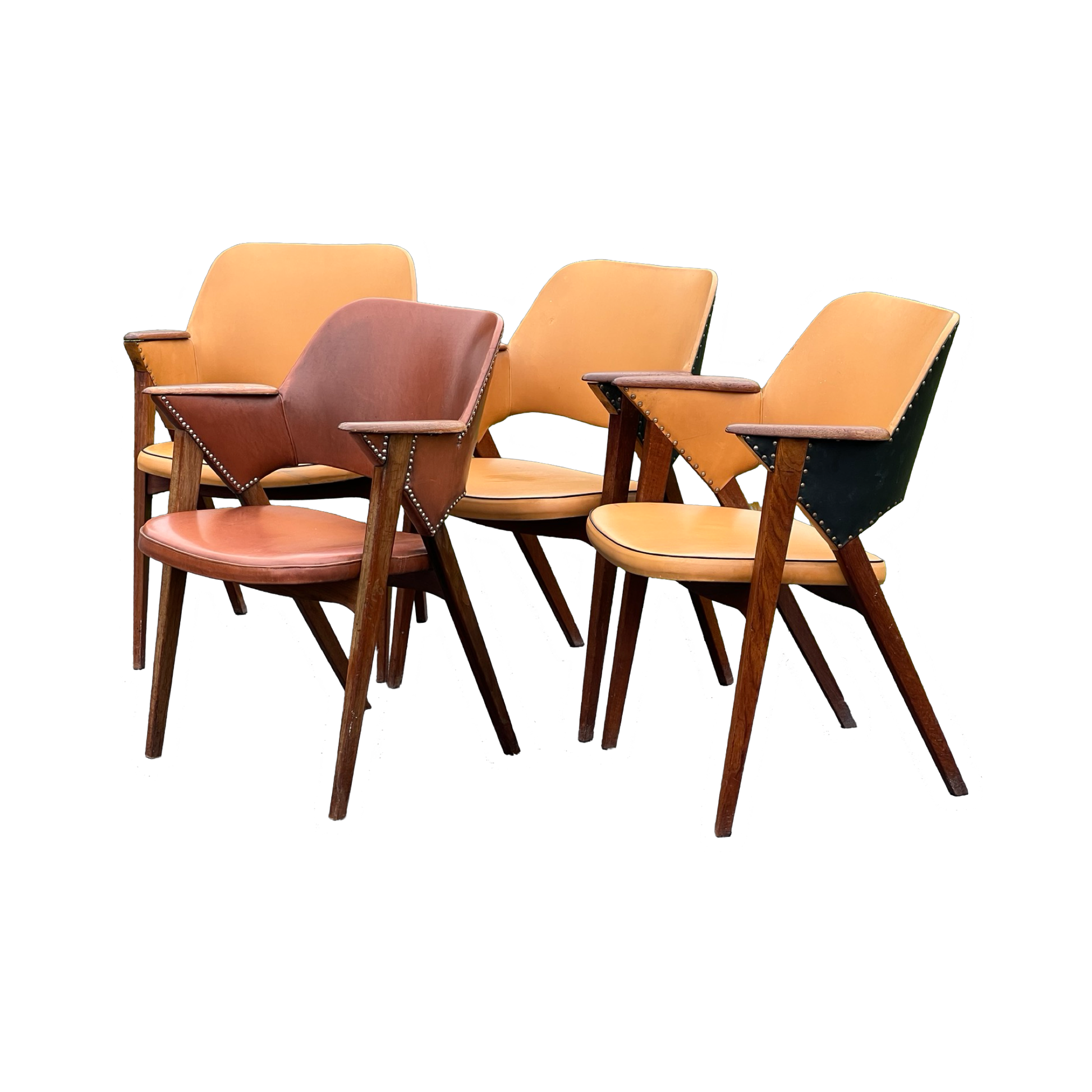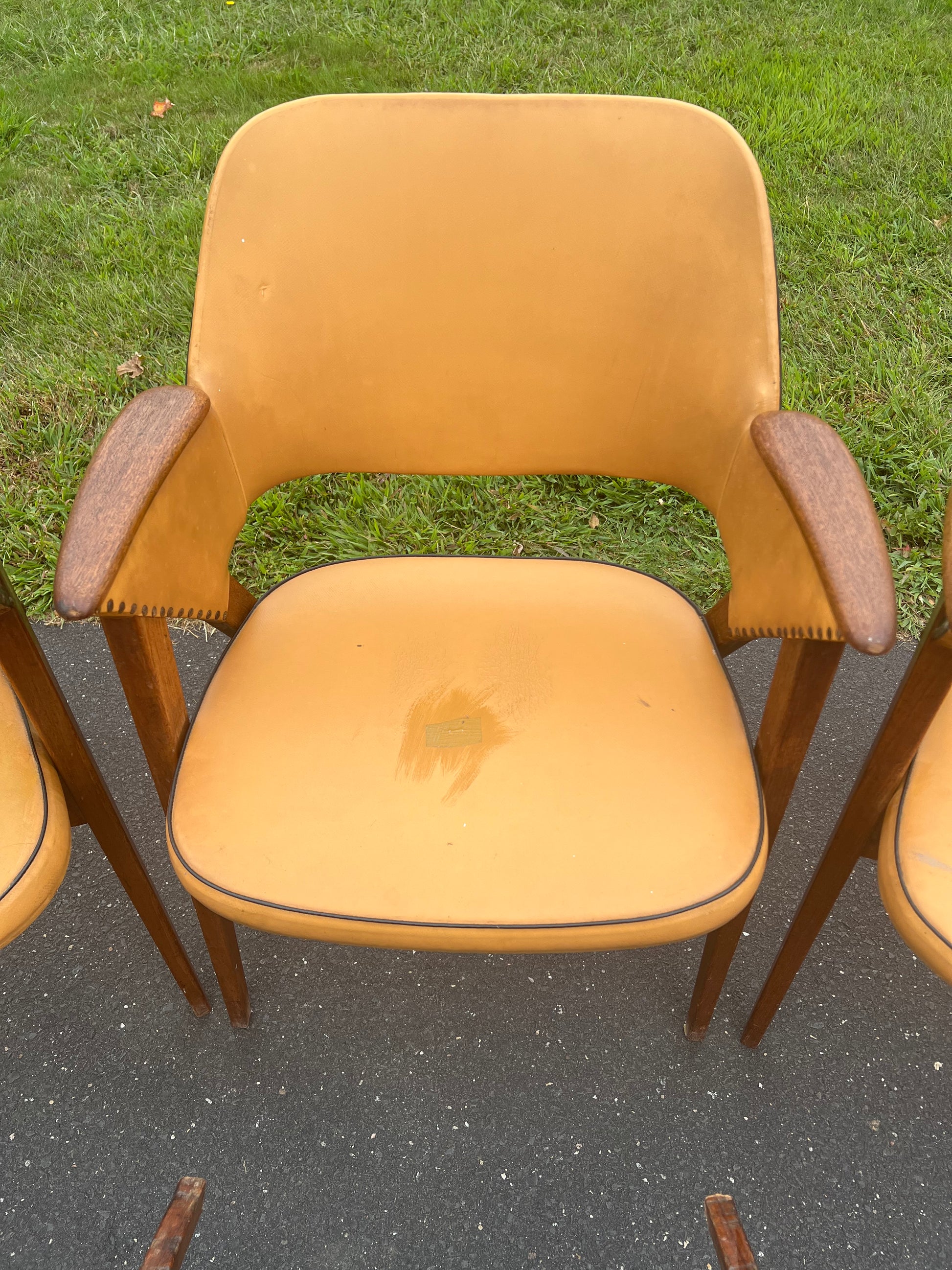 The chairs are upholstered in vinyl, with two of them featuring older vinyl repairs on the seats—an authentic mark of their history and use. This detail adds a layer of character, presenting an excellent opportunity for those who value original condition pieces with stories to tell. Each chair stands out with its unique hue variations, including tan, brown, and black, accented with industrial-style studding along the edges.