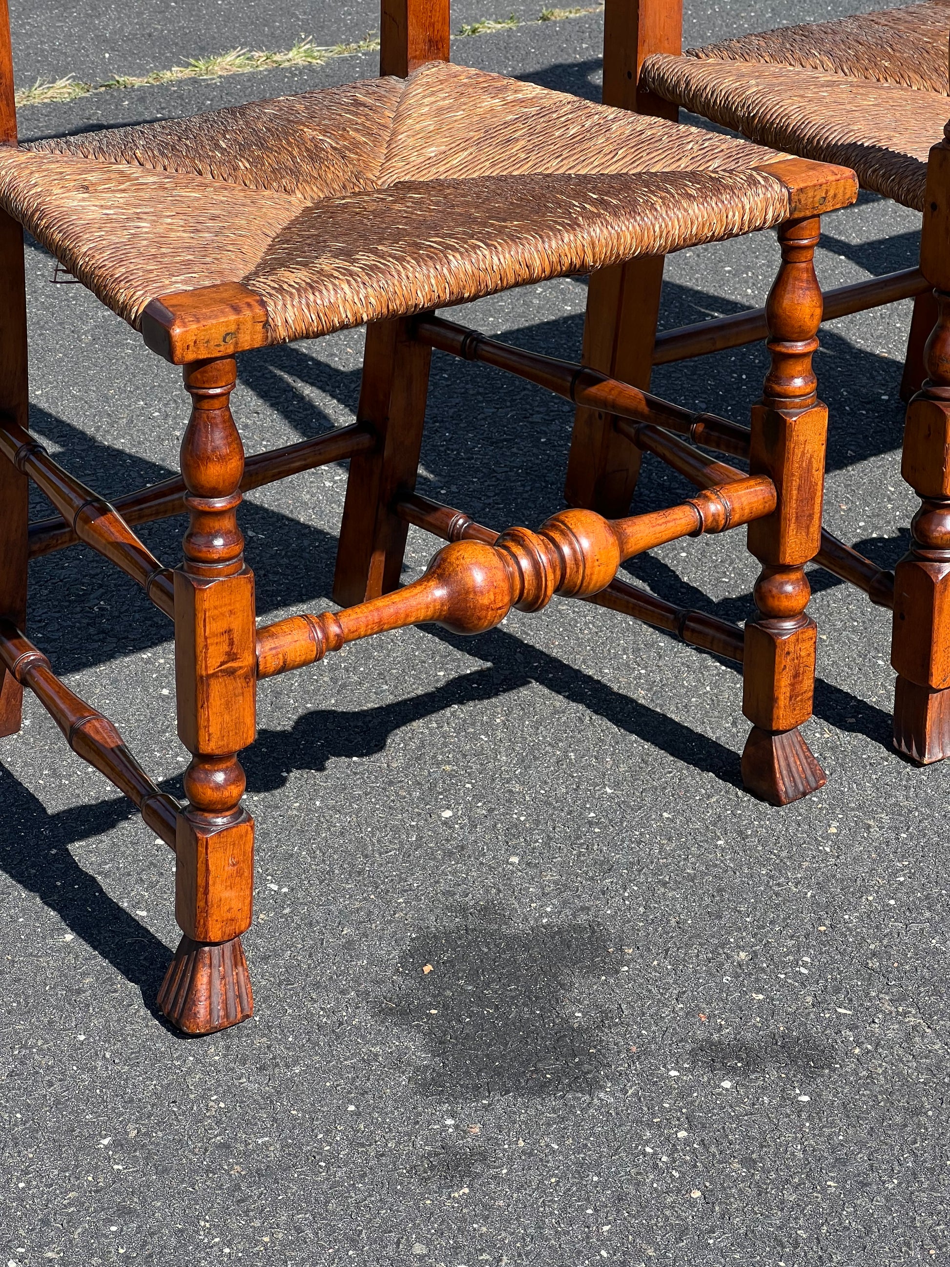 The seats of these chairs are woven with rush, offering a rustic contrast to the smooth, glossy maple. This material choice not only adds durability but also provides a comfortable seating experience. The condition of the rush seating varies across the set, reflecting their authentic age and use, yet they remain sturdy and functional.