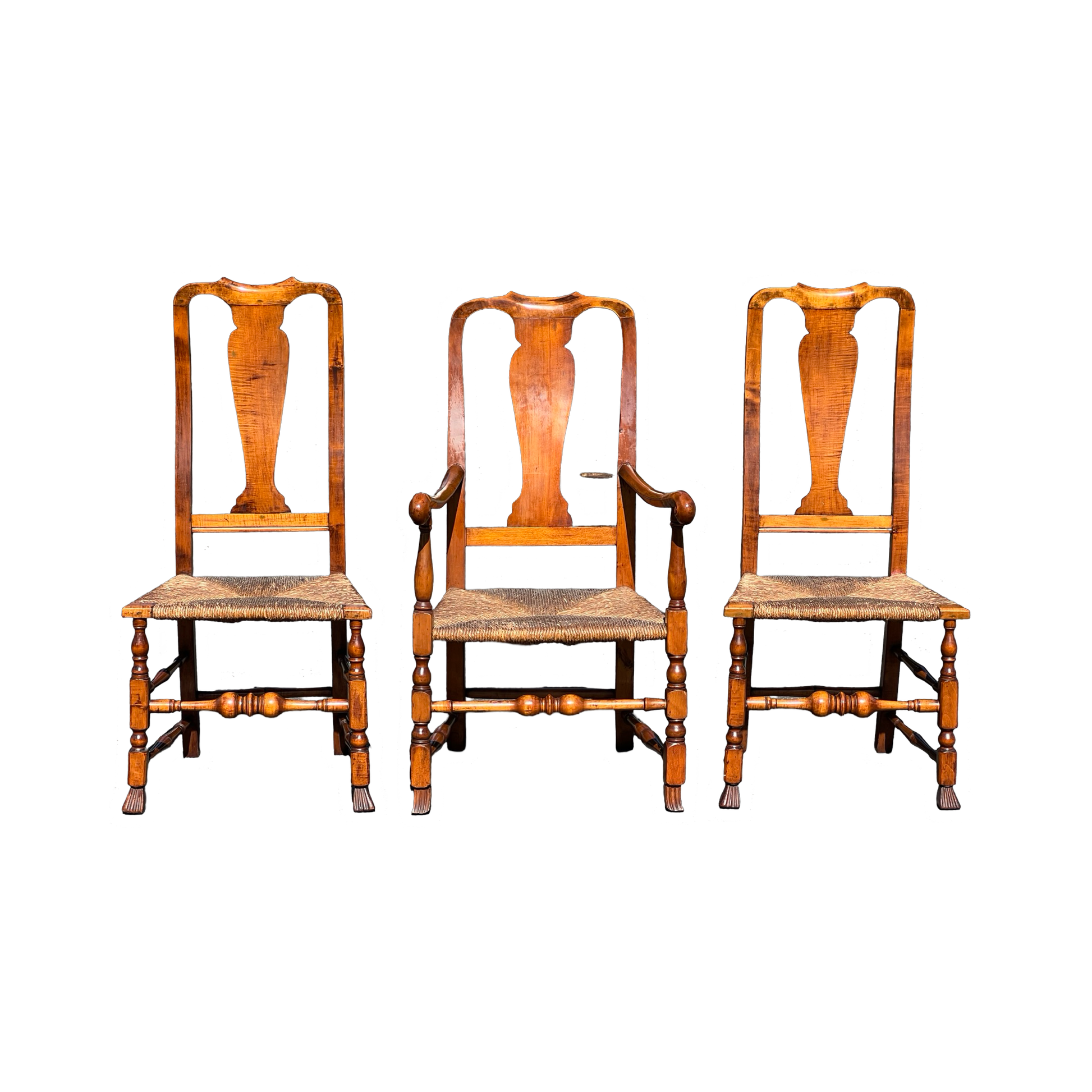 This set of three antique Queen Anne dining chairs, crafted in the late 19th century, showcases the refined elegance typical of the period. Made from curly maple, these chairs exhibit a warm, iridescent grain that enhances their visual allure. The chairs feature traditional Queen Anne silhouettes with gracefully curved lines and classic splat-back designs that highlight their artisanal craftsmanship.