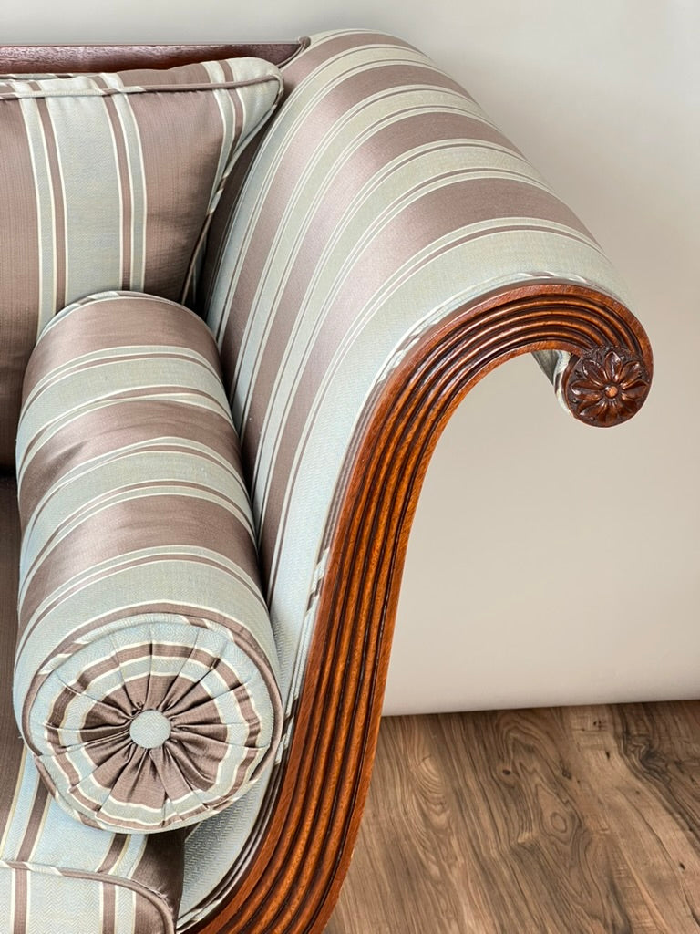 This Vintage David Salmon Furnishers Mahogany Regency Style Sofa perfectly embodies the elegant simplicity of Regency design with its finely crafted mahogany frame and luxurious upholstery. The sweeping, scrolled arms and fluted legs offer graceful detailing, while the dark finish of the mahogany provides a beautiful contrast to the soft, alternating stripes of brown and pale blue on the cushions. The rolled bolsters at either end further enhance the tailored, classic appeal of the sofa, ensuring both comfort and visual interest.