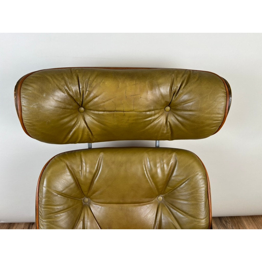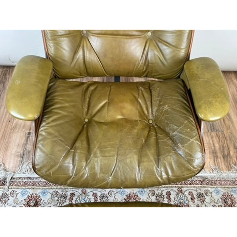 The original olive green leather has developed a beautiful patina, showcasing its age and authenticity. There is visible cracking and a couple of gouges in the seat, but the leather remains serviceable and structurally sound. The swivel base allows for effortless movement, while the matching ottoman completes the luxurious lounging experience.