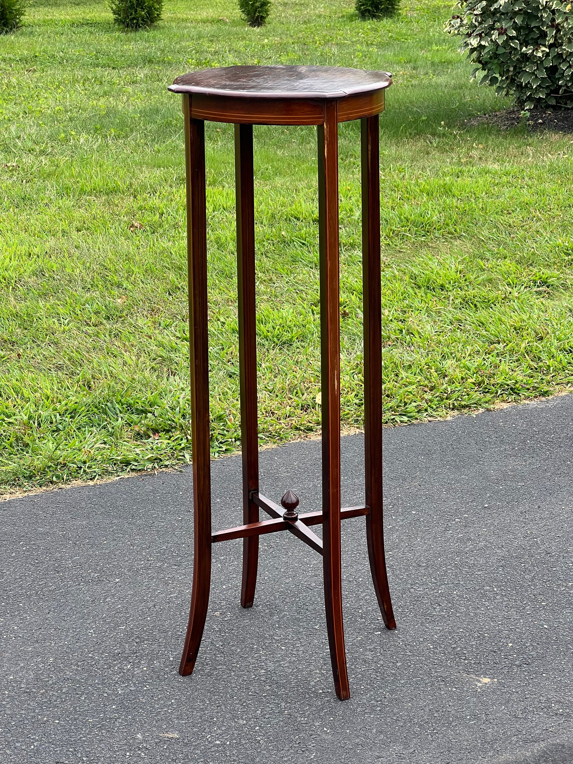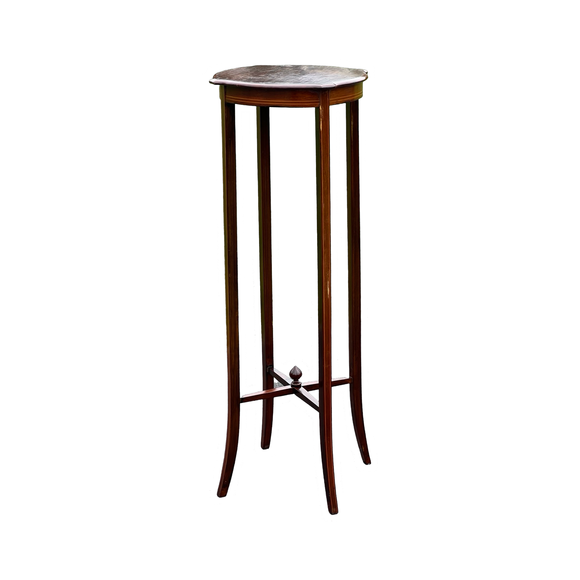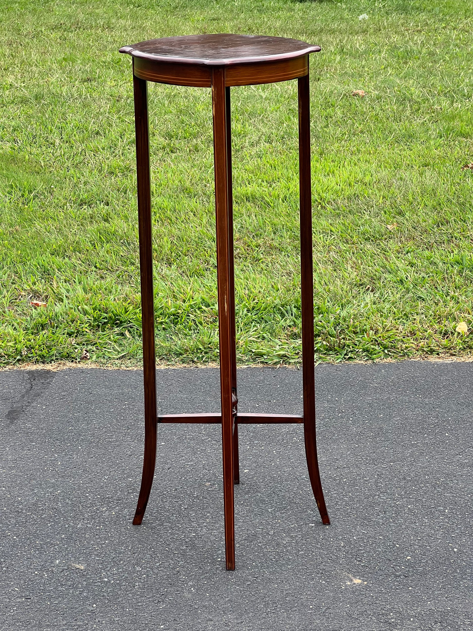 This vintage mahogany inlaid fern stand offers a charming blend of utility and ornamental elegance, perfect for enhancing indoor plant displays or showcasing cherished art pieces. The stand features a beautifully shaped top, delicately inlaid to highlight the intricate grain patterns of the mahogany, providing a stylish platform that commands attention.