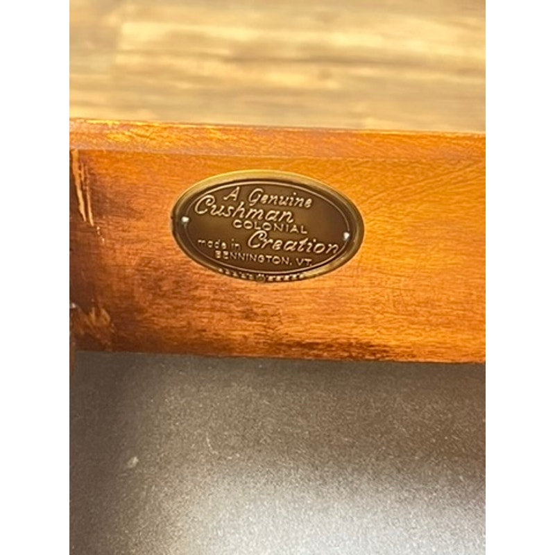 This vintage Mid-Century nightstand by Cushman epitomizes the sleek, practical design characteristic of the period. Crafted from robust rock maple, it features a single drawer with a minimalist handle, set above an open shelf that provides additional storage or display space. The nightstand’s silhouette, with its smooth lines and subtly curved legs, reflects the Mid-Century modern aesthetic that prioritizes both form and function.