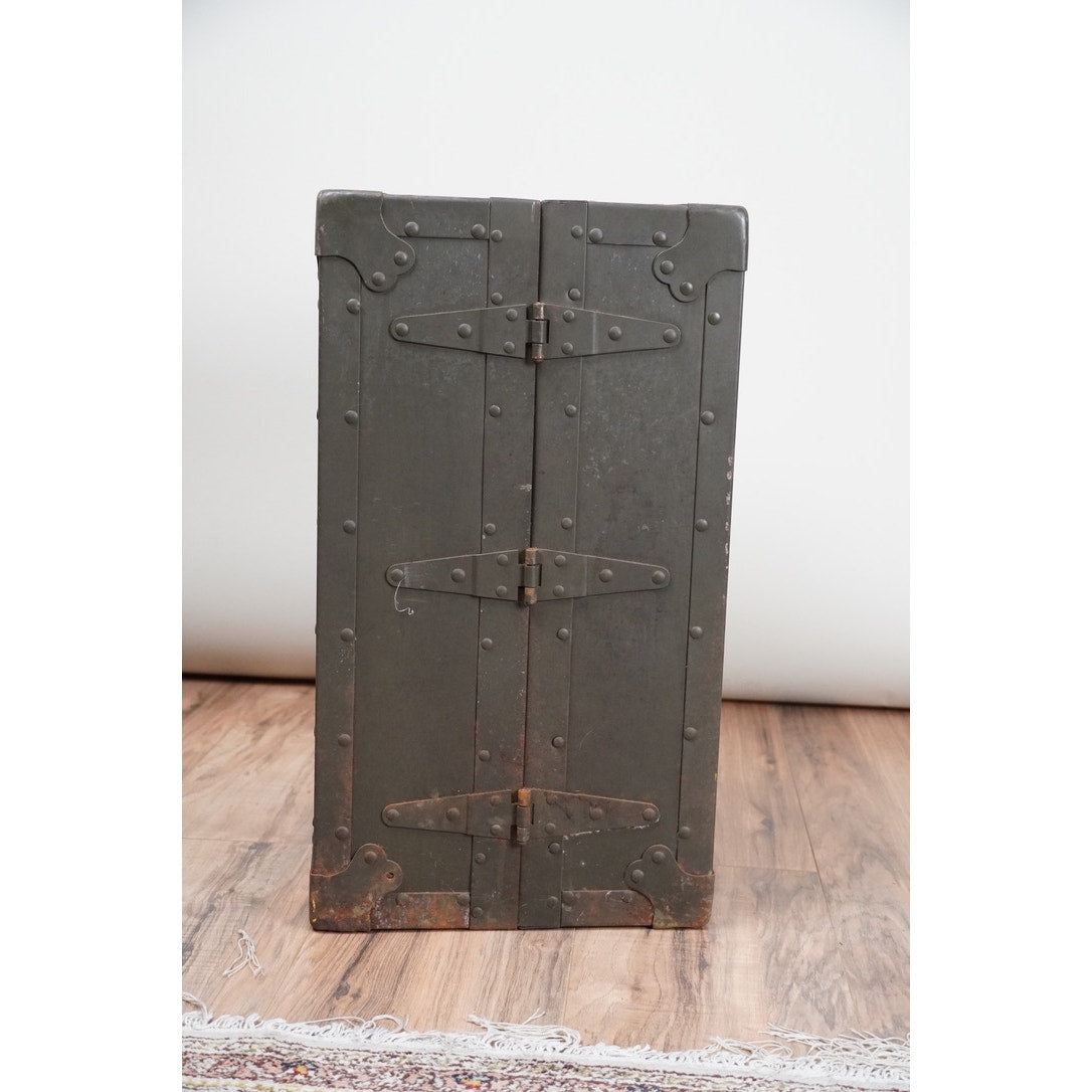This vintage military spare parts cabinet was manufactured to MIL-C-4710 specifications and originates from Westover Air Force Base. Built in a rugged olive drab steel case with reinforced corners and stenciled military markings, this piece was designed for transporting and storing small parts essential to aircraft maintenance.