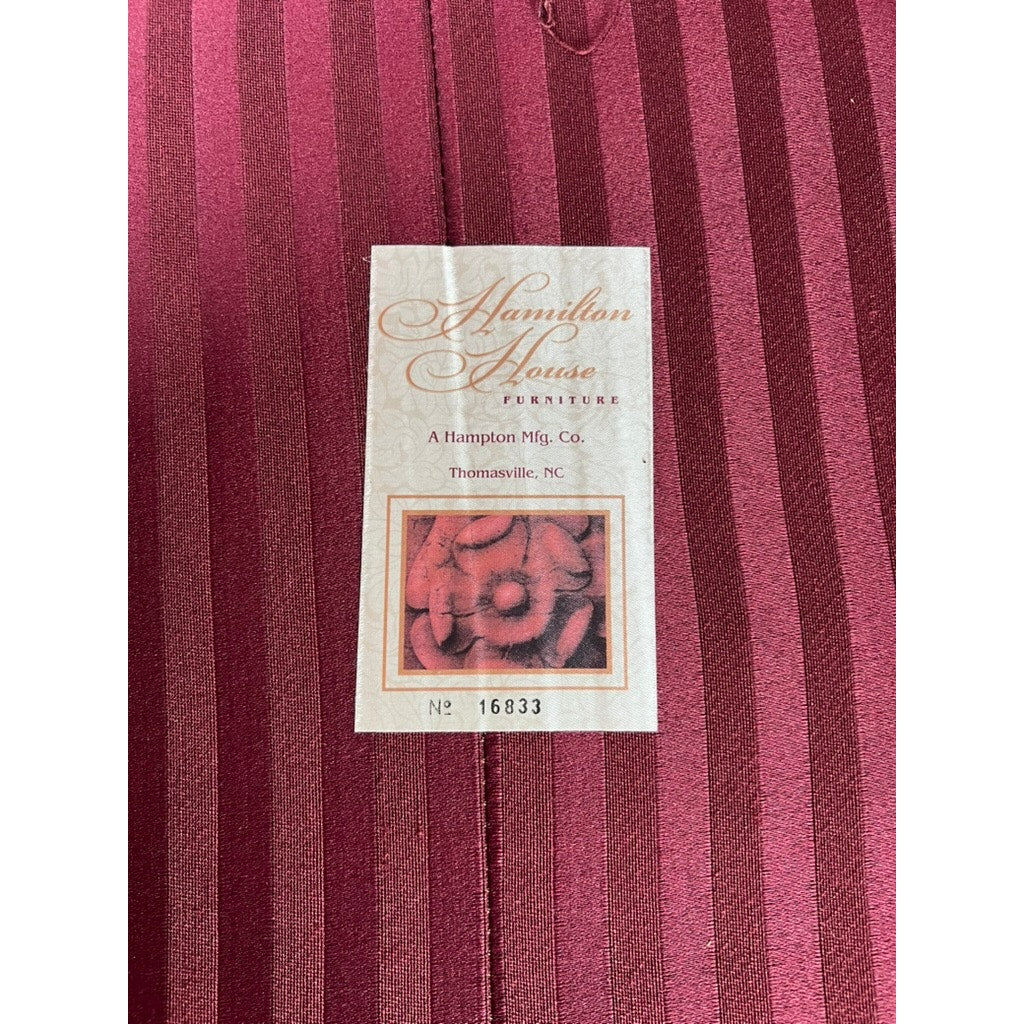 This handsome pair of vintage wing back chairs by Hamilton House offers the perfect combination of traditional comfort and timeless design. Each chair features a classic high back with graceful wings that curve seamlessly into rolled arms, upholstered in rich burgundy striped fabric that adds both warmth and sophistication to any room. The tailored lines and plush cushioning exemplify the craftsmanship for which Hamilton House was known.