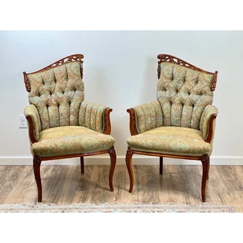 Perfect for those who appreciate the sophistication of vintage furniture along with a flair for dramatic designs, these chairs can transform any room into a stately salon. They are ideal for creating a focal point in a living room, a sophisticated touch in a bedroom, or as distinguished guest seating in an office environment. Their timeless beauty ensures they remain a cherished addition to any collection of fine antiques.
