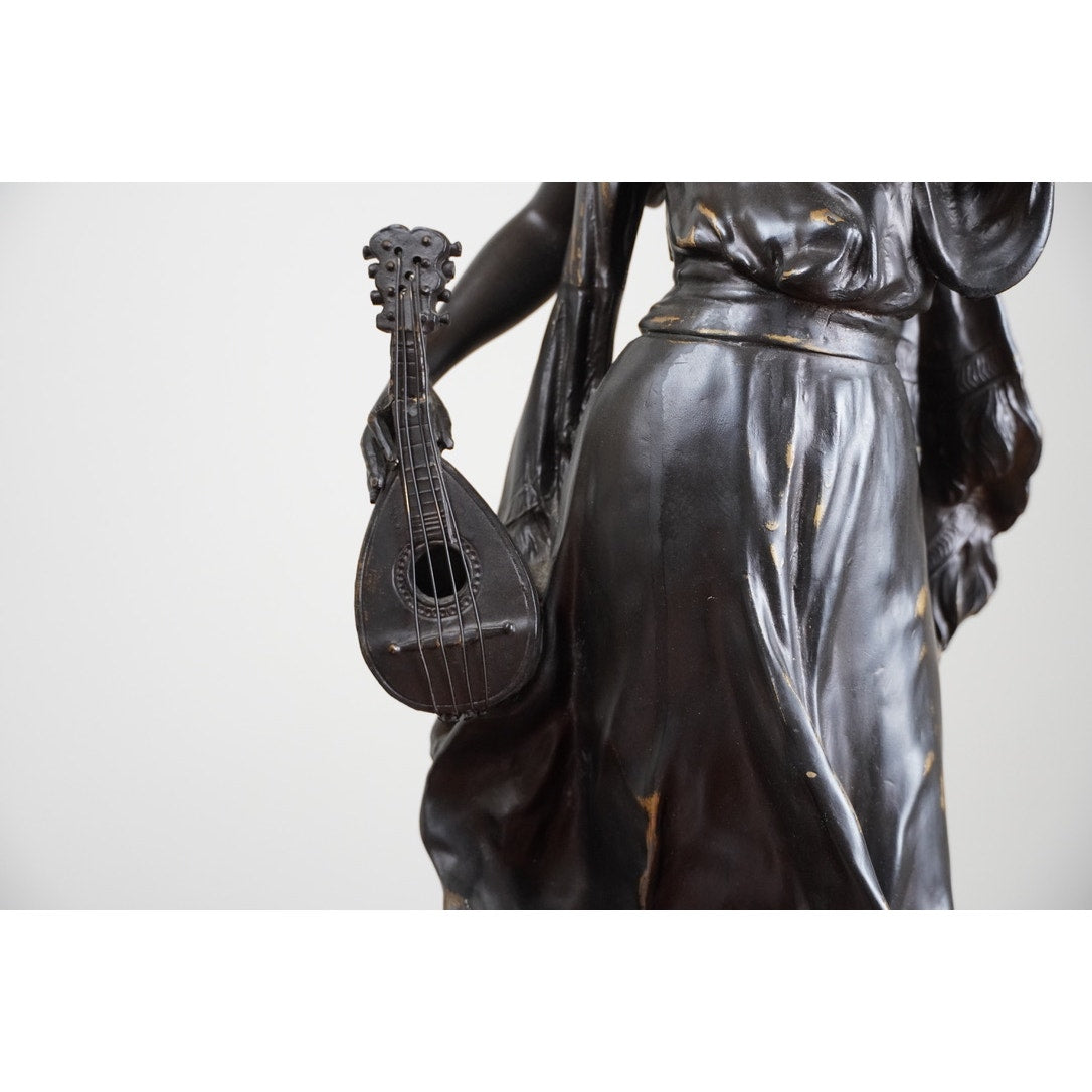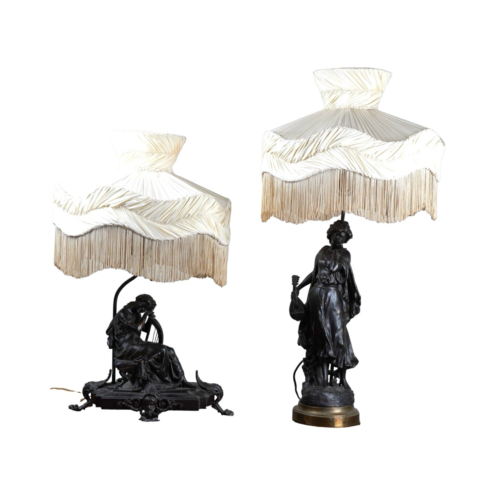 This vintage pair of Art Nouveau figural lamps, dating to around 1920, reflects the elegance and romantic style of the period. Crafted of cast metal with a bronze finish, each lamp features a finely modeled figure — one seated beside a lyre, the other standing and holding a mandolin. Their expressive forms and flowing drapery are characteristic of the Art Nouveau movement, making them striking decorative pieces.