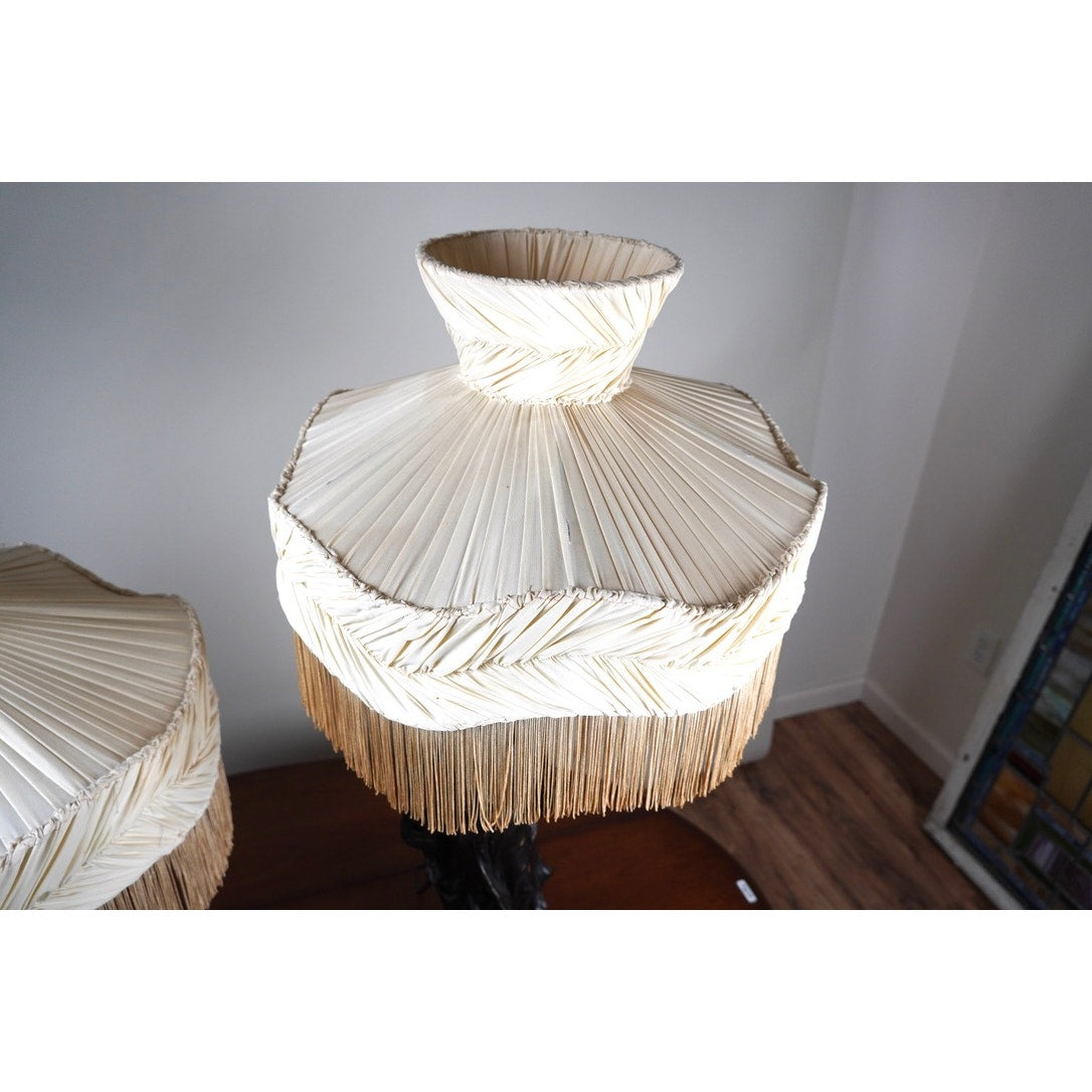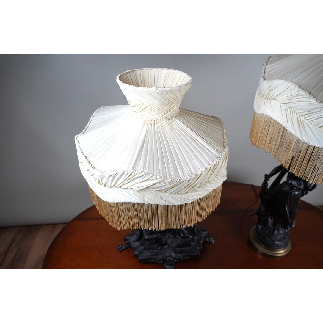 The lamps are topped with later fabric shades, styled with cream-colored pleats and long fringe, complementing their early 20th century design. Together, they create a dramatic statement when displayed on a sideboard, console, or mantel.