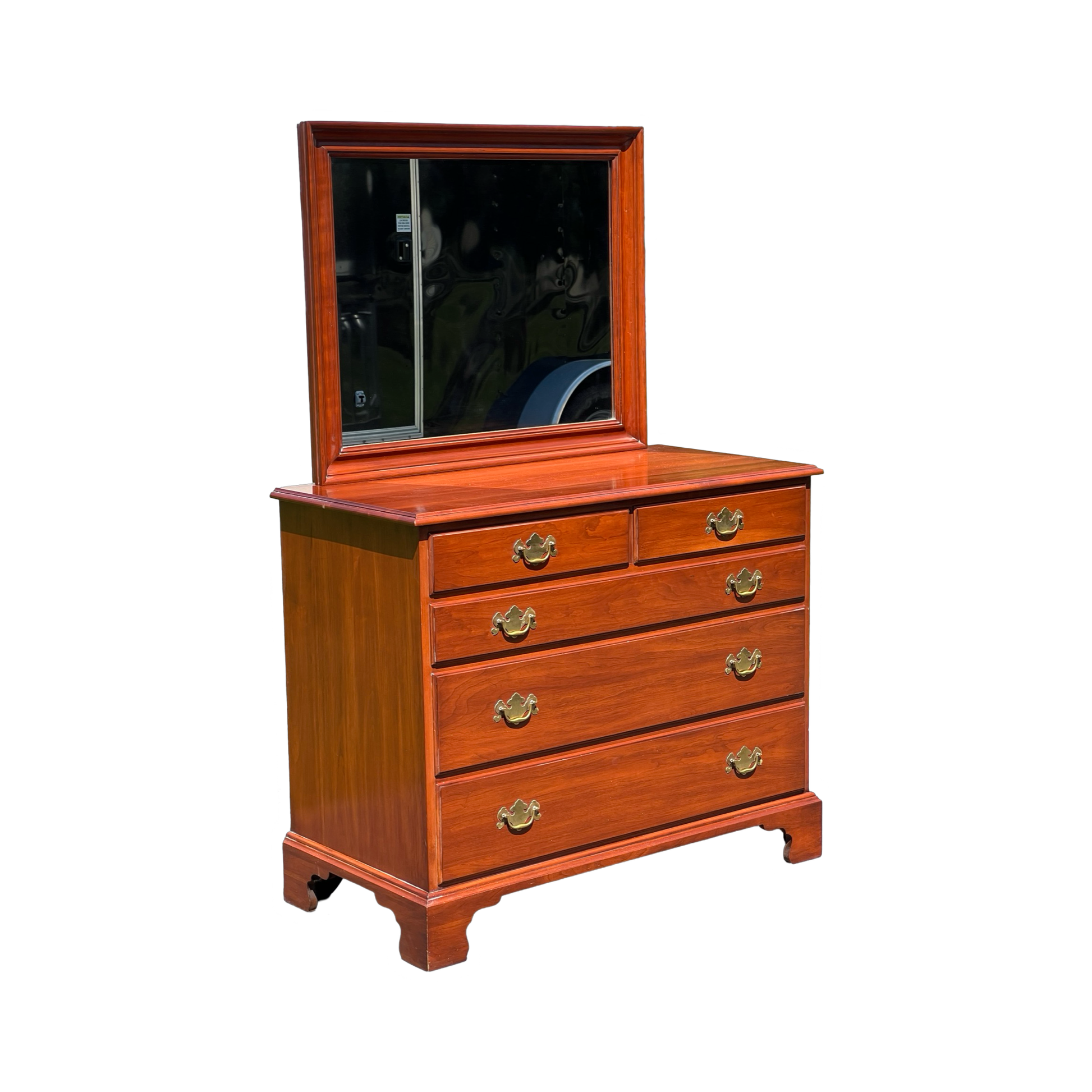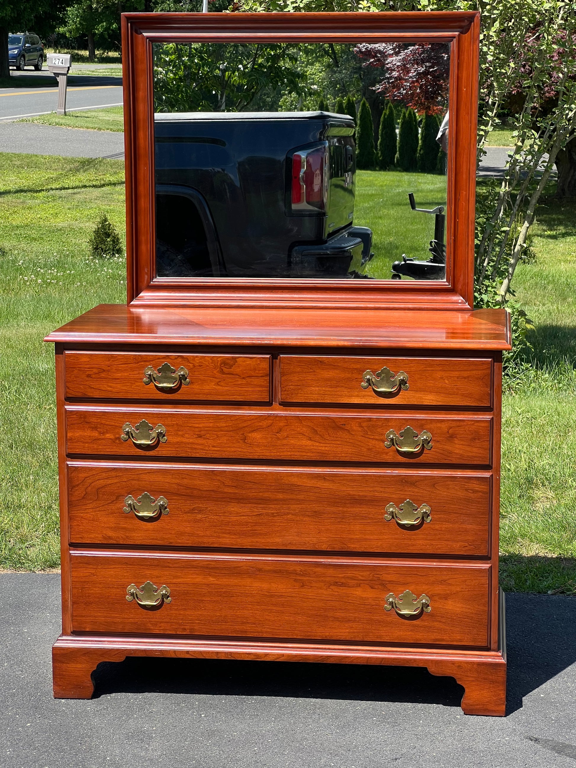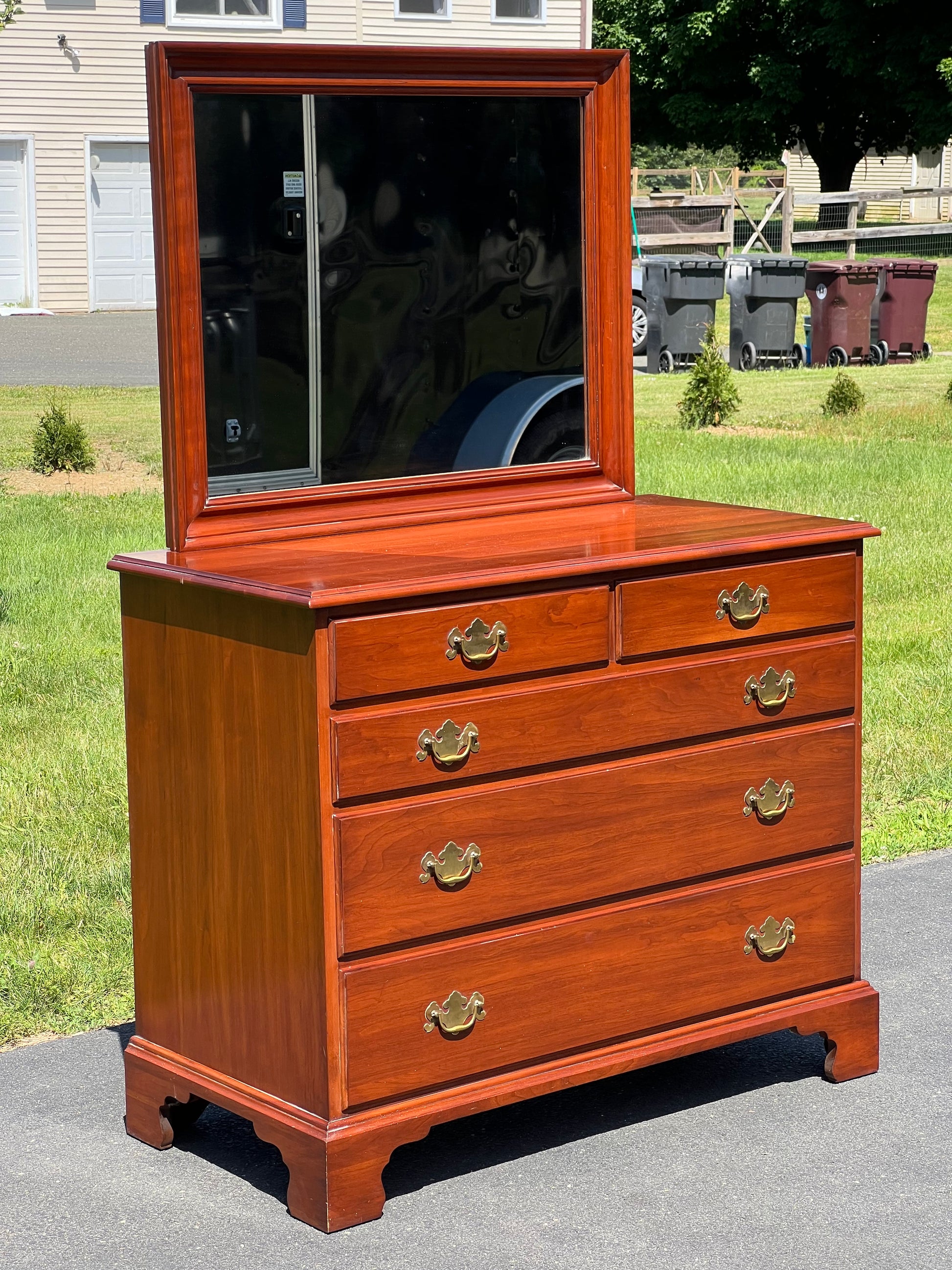 Introducing a stunning Vintage Solid Black Cherry Dresser with Mirror by Henkel Harris, a piece that exemplifies the timeless elegance and superior craftsmanship for which Henkel Harris is renowned. This dresser, crafted from solid black cherry wood, combines functionality with classic beauty, making it a perfect addition to any bedroom.
