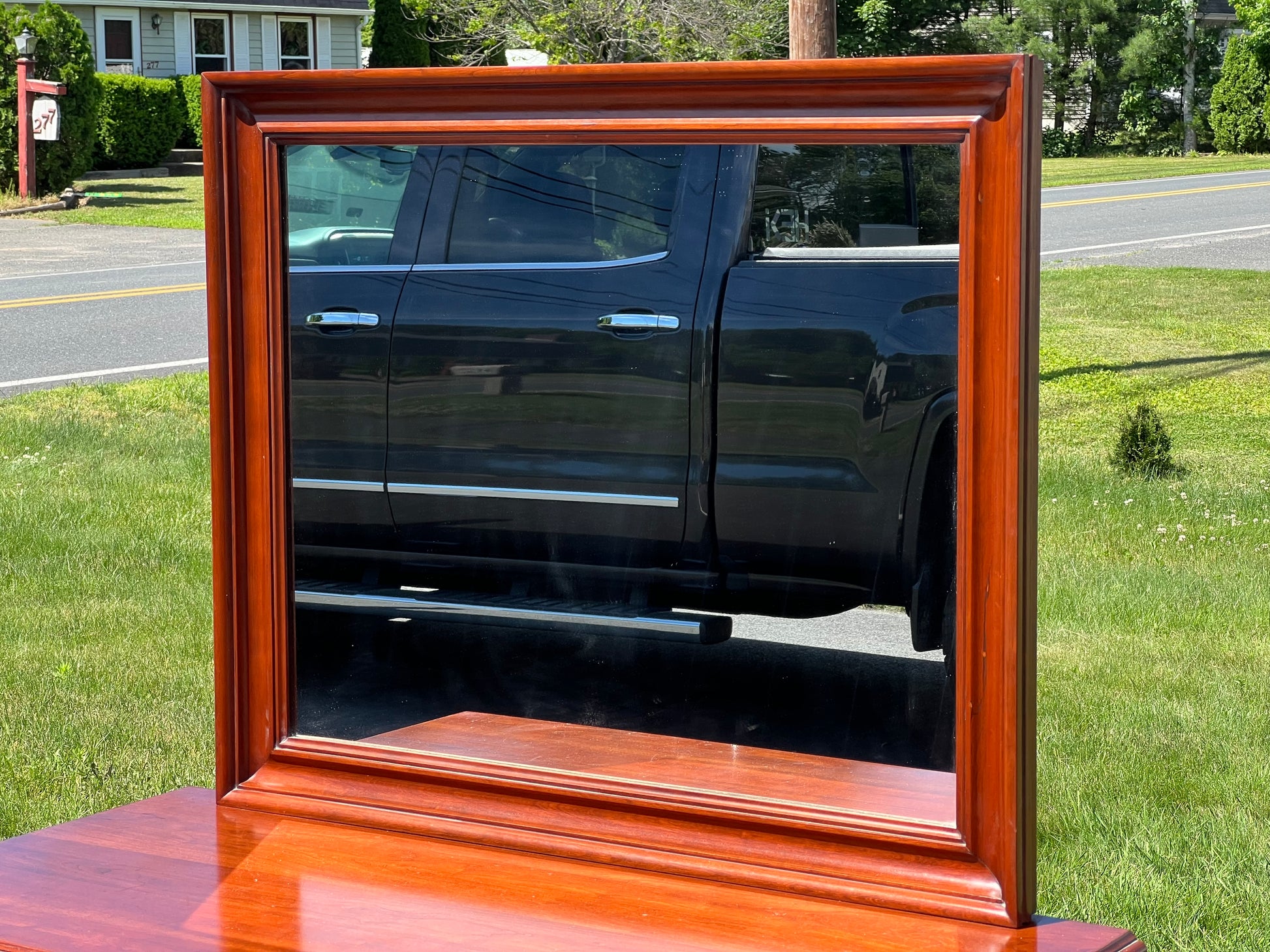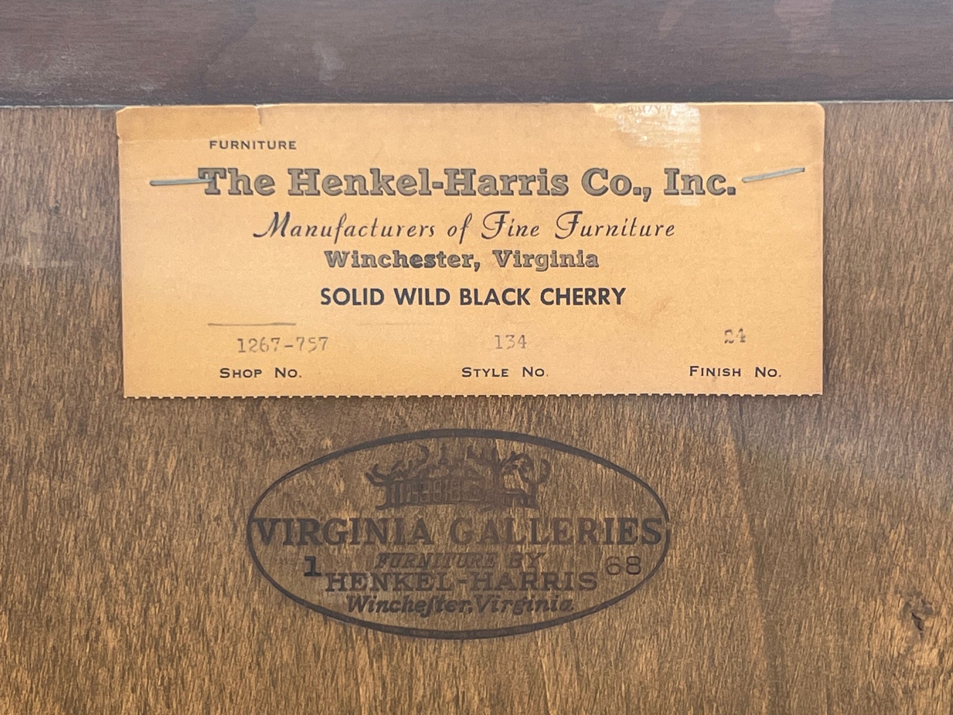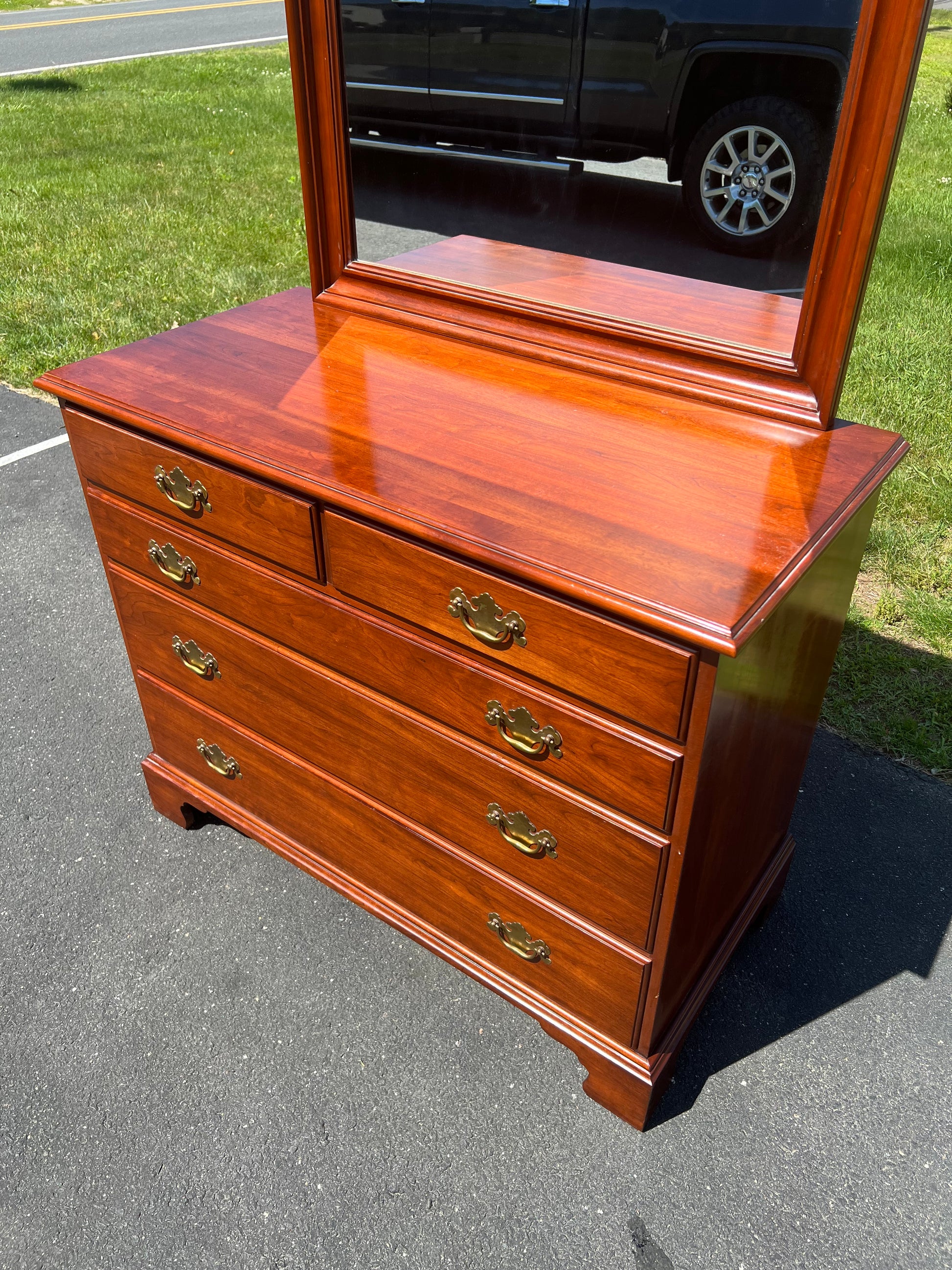Introducing a stunning Vintage Solid Black Cherry Dresser with Mirror by Henkel Harris, a piece that exemplifies the timeless elegance and superior craftsmanship for which Henkel Harris is renowned. This dresser, crafted from solid black cherry wood, combines functionality with classic beauty, making it a perfect addition to any bedroom.