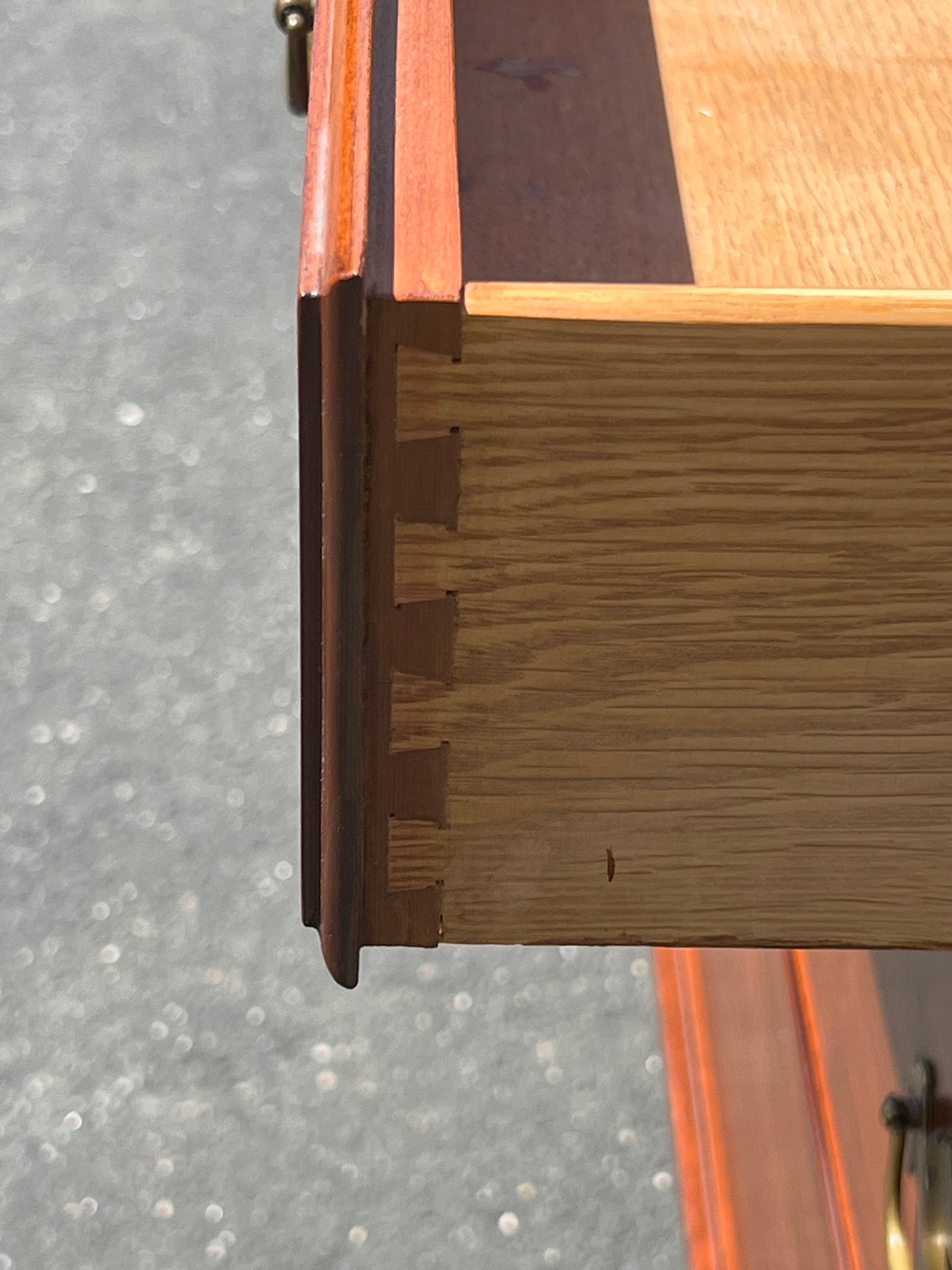 The dresser features a rich cherry finish that highlights the natural beauty and grain of the wood. It includes six spacious drawers, providing ample storage for clothing, linens, and personal items. Each drawer is adorned with elegant brass hardware, adding a touch of sophistication to the piece.