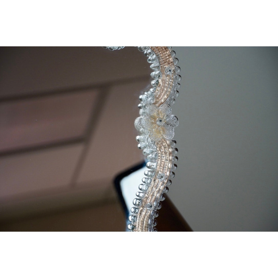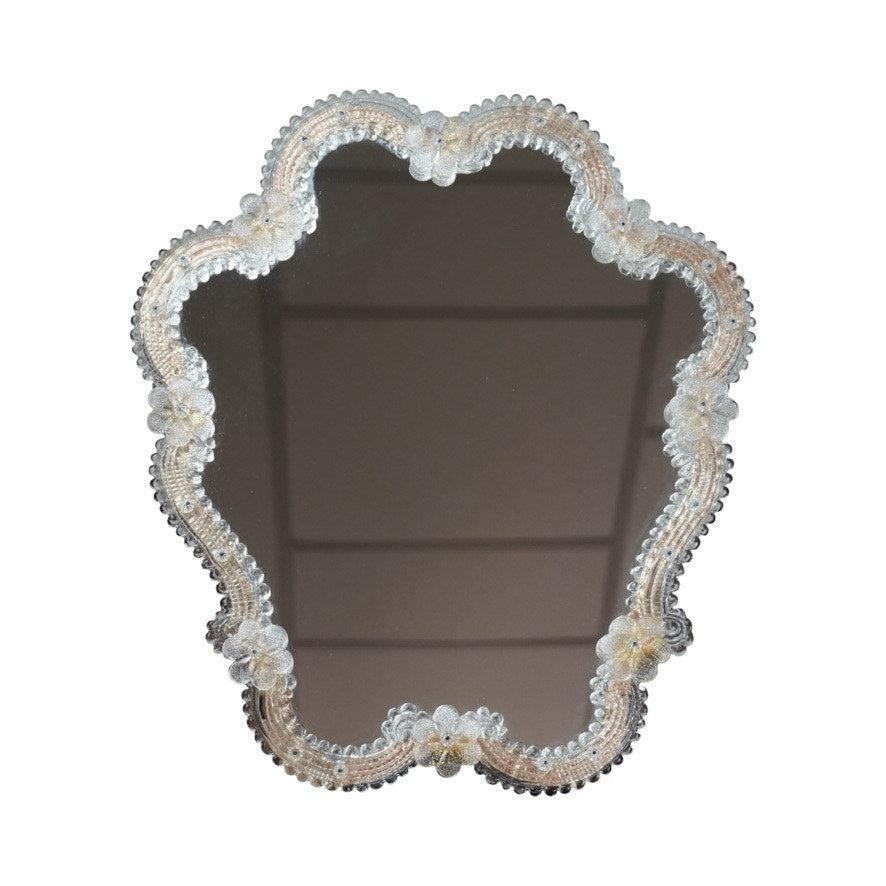 Perfect as a dressing table mirror or a wall-mounted accent, this piece captures the romantic charm of Murano artistry while remaining versatile for modern interiors. The mirror itself is clean and reflective, while the handcrafted details add dimension and sparkle.